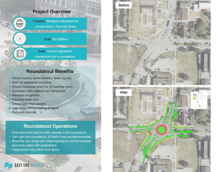 In September of 2018, the East End District entered into an advanced funding agreement with TxDOT that consists of the engineering and reconstruction of the intersection at Navigation Boulevard, Jensen Drive, and Runnels Street to include an urban roundabout, pedestrian elements, streetscape and bus stop improvements. Additionally, the District hopes to include a public art installation on the roundabout and funding has been secured for public engagement related to this installation. Public engagement and design are forthcoming. No funding source for public art on the roundabout has been identified at this time.